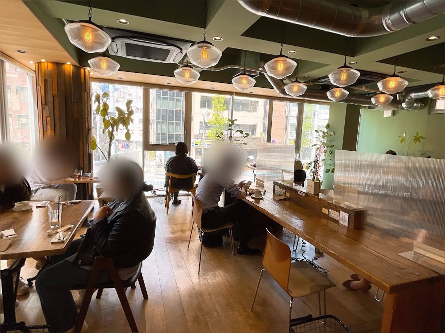 左右には2人がけテーブル3席、4人がけテーブル1席。