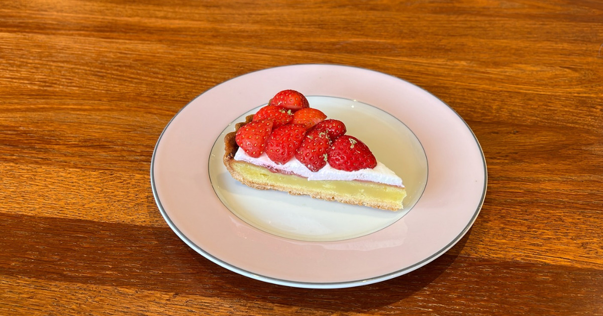 アーモンドタルト生地にラズベリーソース、生クリームが重なり、いちごがトッピング。