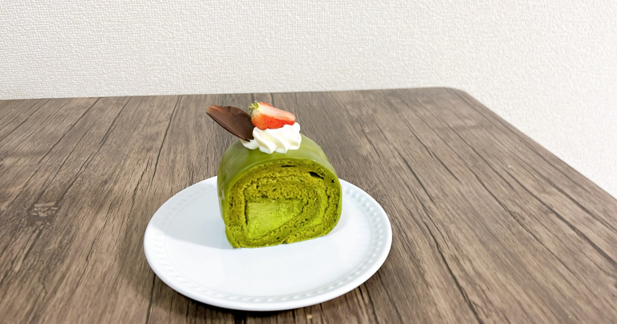 抹茶クリームを抹茶スポンジで巻き込み、いちごやクリームがトッピング。